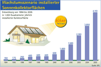 Seit Jahren wächst der Markt für Solarwärmeanlagen mit zweistelligen Raten, durchschnittlich 30%. Im Jahr 2000 gab es sogar ein Marktwachstum von 50%. Dabei wurden rund 75.000 Anlagen mit über 600.000 m² Sonnenkollektoren installiert. Ende 2000 summierte sich die Gesamtfläche installierter Sonnenkollektoren in Deutschland auf rund 2,9 Mio. m² in 360.000 Anlagen zur Trinkwassererwärmung und Heizungsunterstützung.